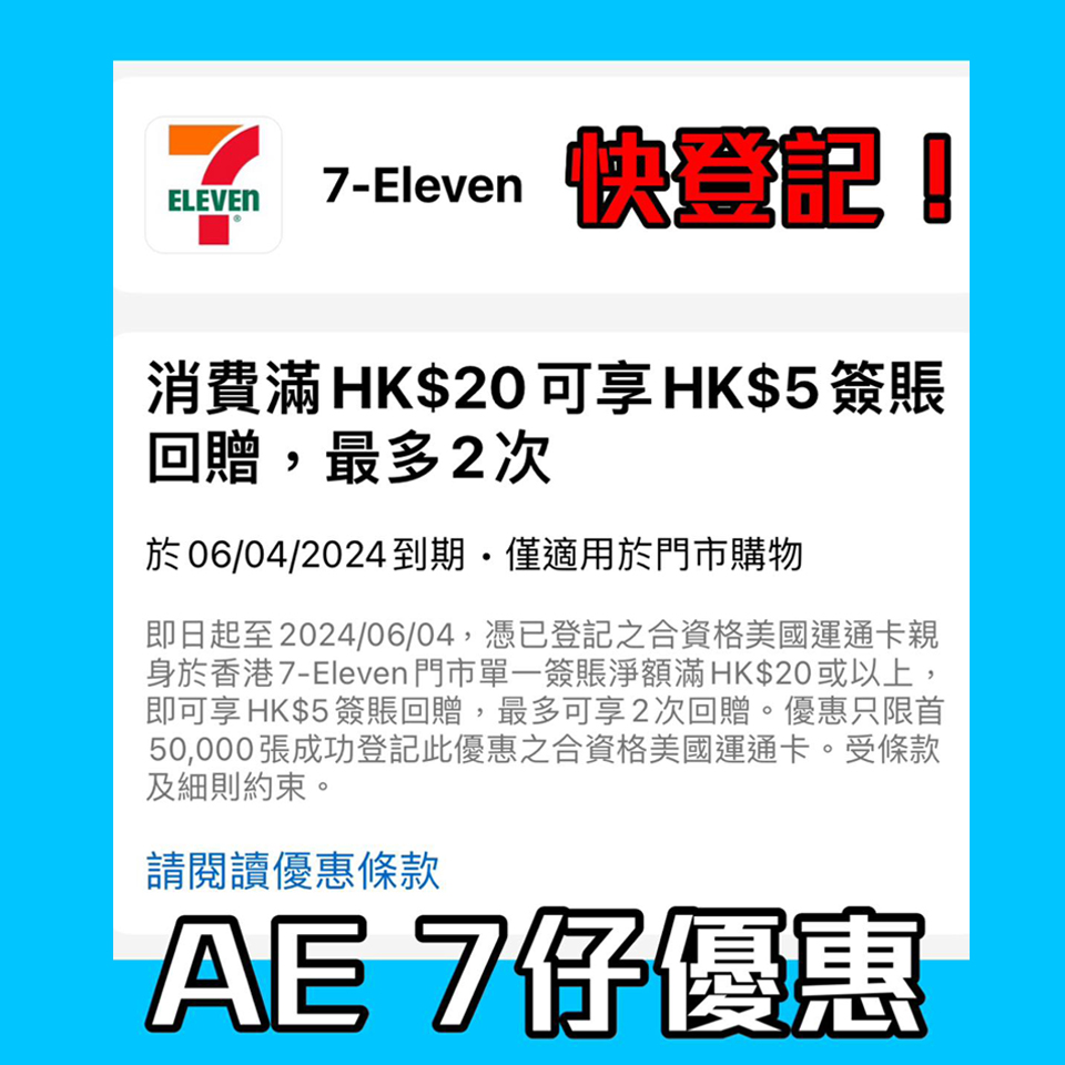 【AE 7-11優惠】憑已登記AE信用卡於7-11便利店簽賬滿HK$20可享HK$5簽賬回贈!快啲登記!