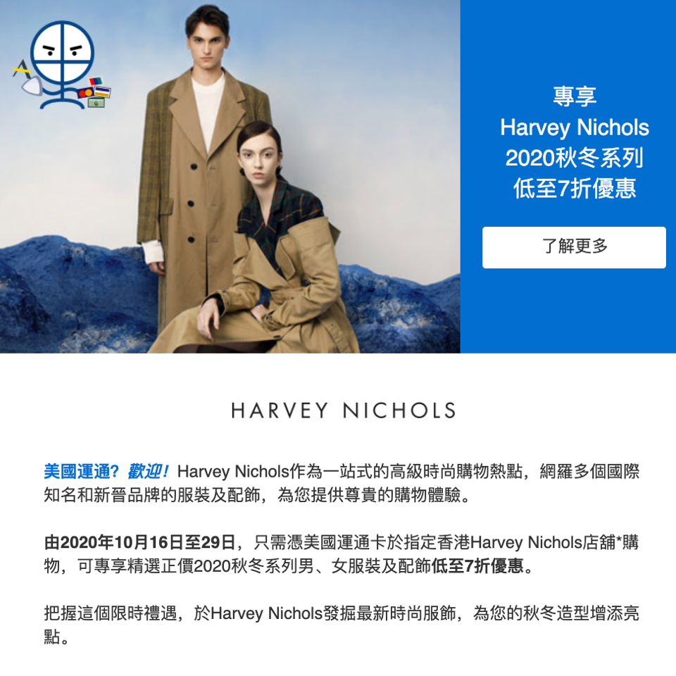Harvey Nichols AE信用卡優惠做到幾時呀?