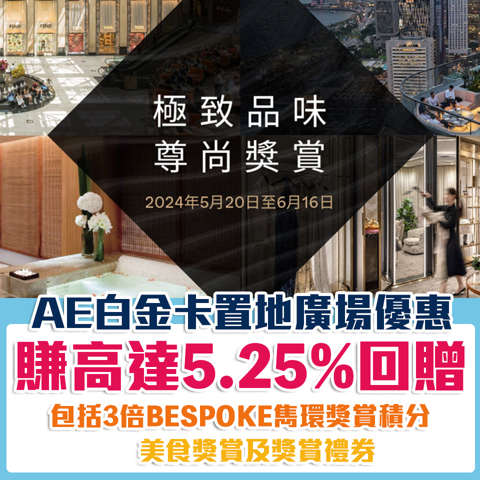 AE置地廣場簽賬回贈優惠!憑AE白金卡於置地廣場購物享高達5.25%回贈,包括3倍BESPOKE雋環獎賞積分、美食獎賞及獎賞禮券!優惠期由即日起至2024年6月16日。