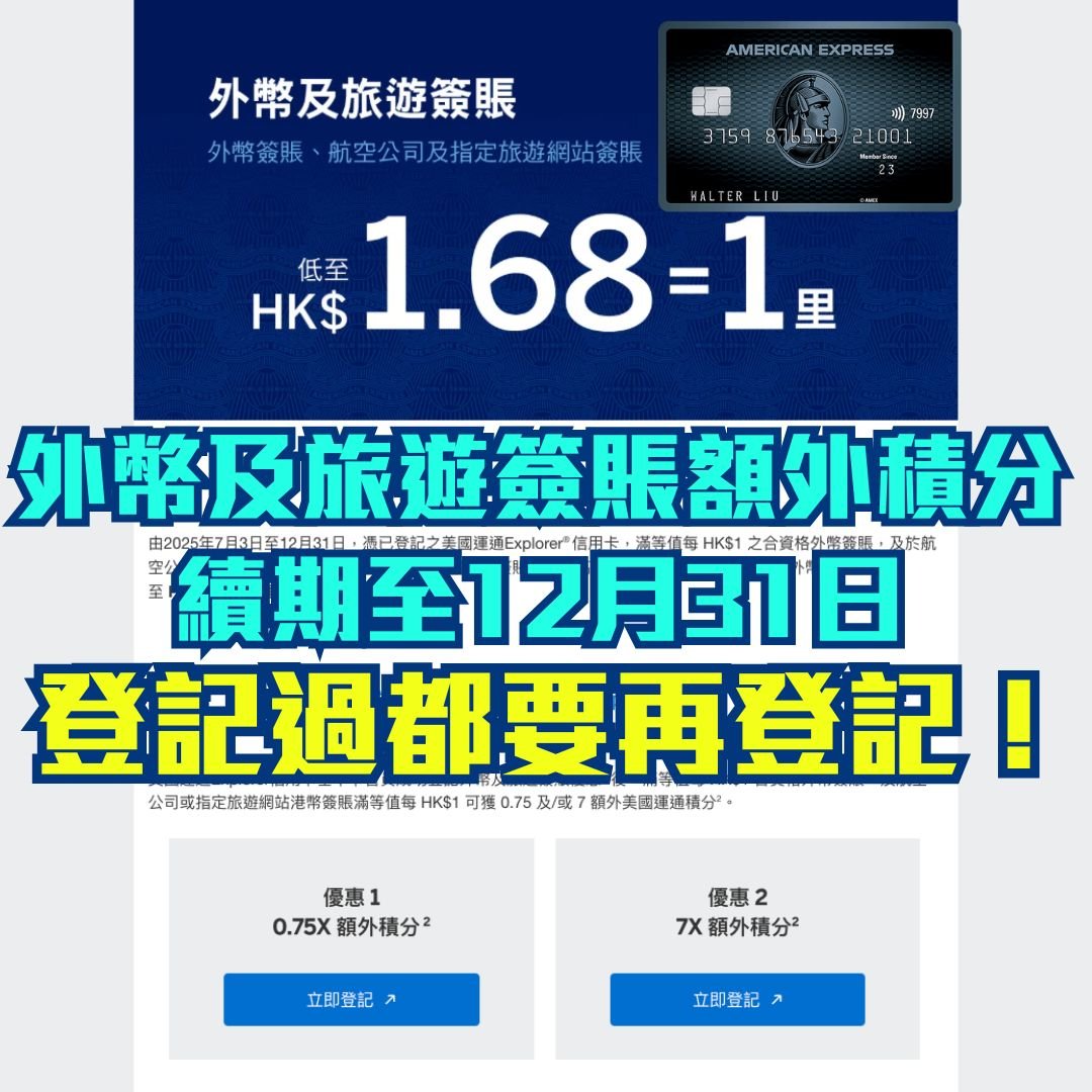 首先要記得登記晒2個優惠,其次要記得每季上限HK$10,000先有額外7X,過咗之後AE Explorer外幣簽賬會有3.75X。優惠續咗期至2025年12月31日,之前登記過都要再登記!