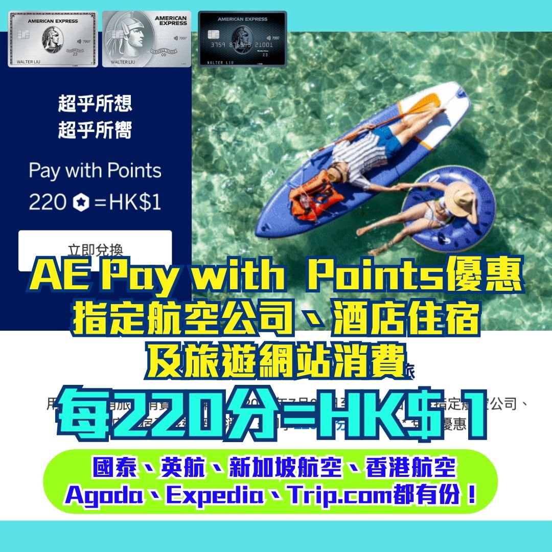 - 指定航空公司、酒店住宿及旅遊網站消費每220 AE積分=HK$1抵銷合資格簽賬 (平時要每300積分=HK$1)