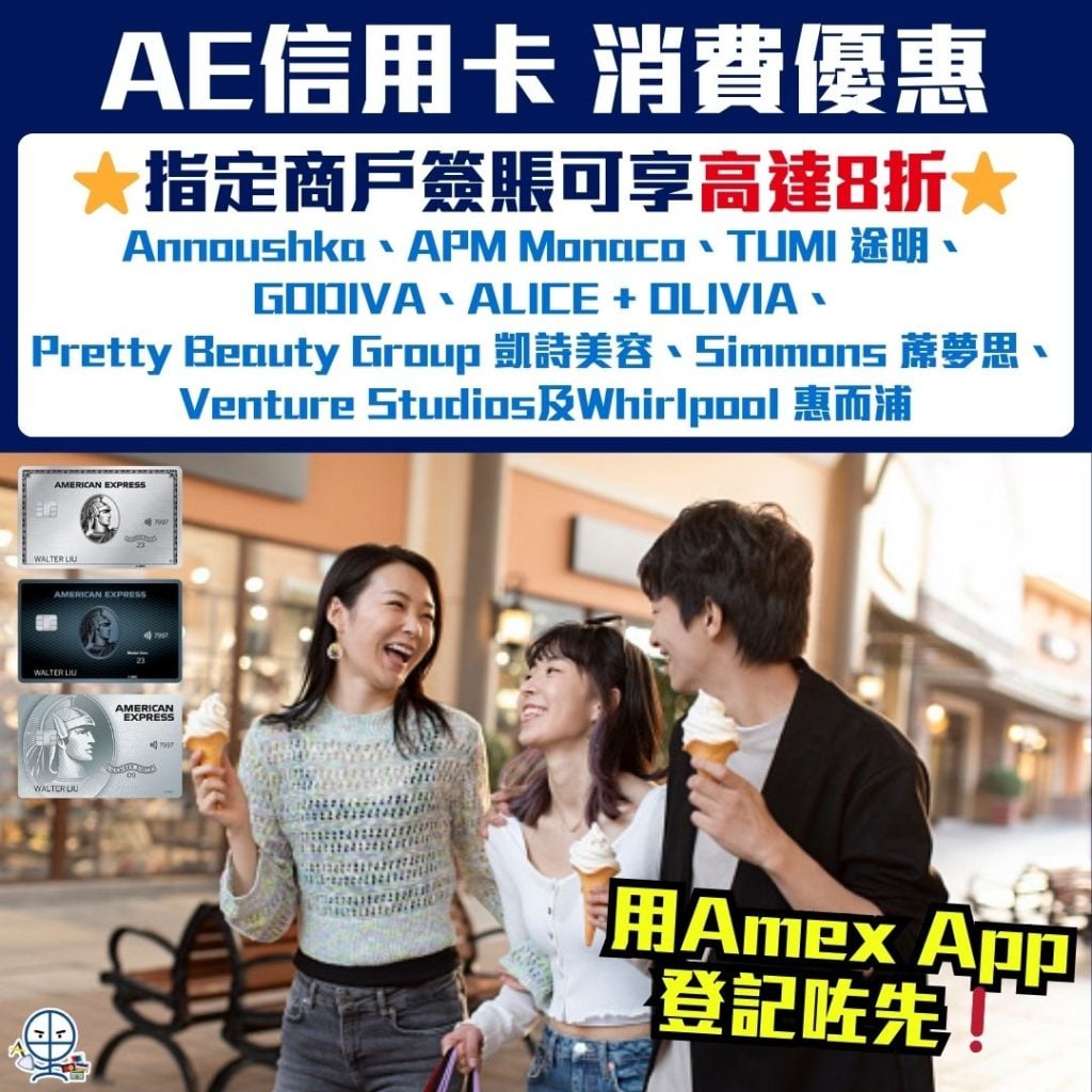 • 答:今次AE消費優惠商戶名單包括:Annoushka、APM Monaco、TUMI 途明、GODIVA、ALICE + OLIVIA、Pretty Beauty Group 凱詩美容、Simmons 蓆夢思、Venture Studios及Whirlpool 惠而浦。