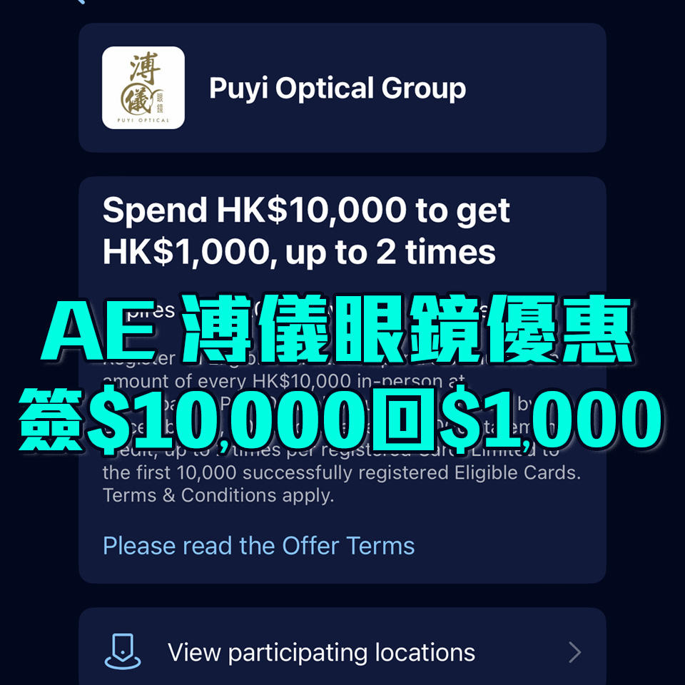 AE溥儀眼鏡優惠!憑已登記AE信用卡於溥儀眼鏡累積簽賬每滿HK$10,000可享HK$1,000簽賬回贈。優惠期內最多可享優惠2次,合共HK$2,000簽賬回贈,優惠期由即日起至2023年12月31日。
