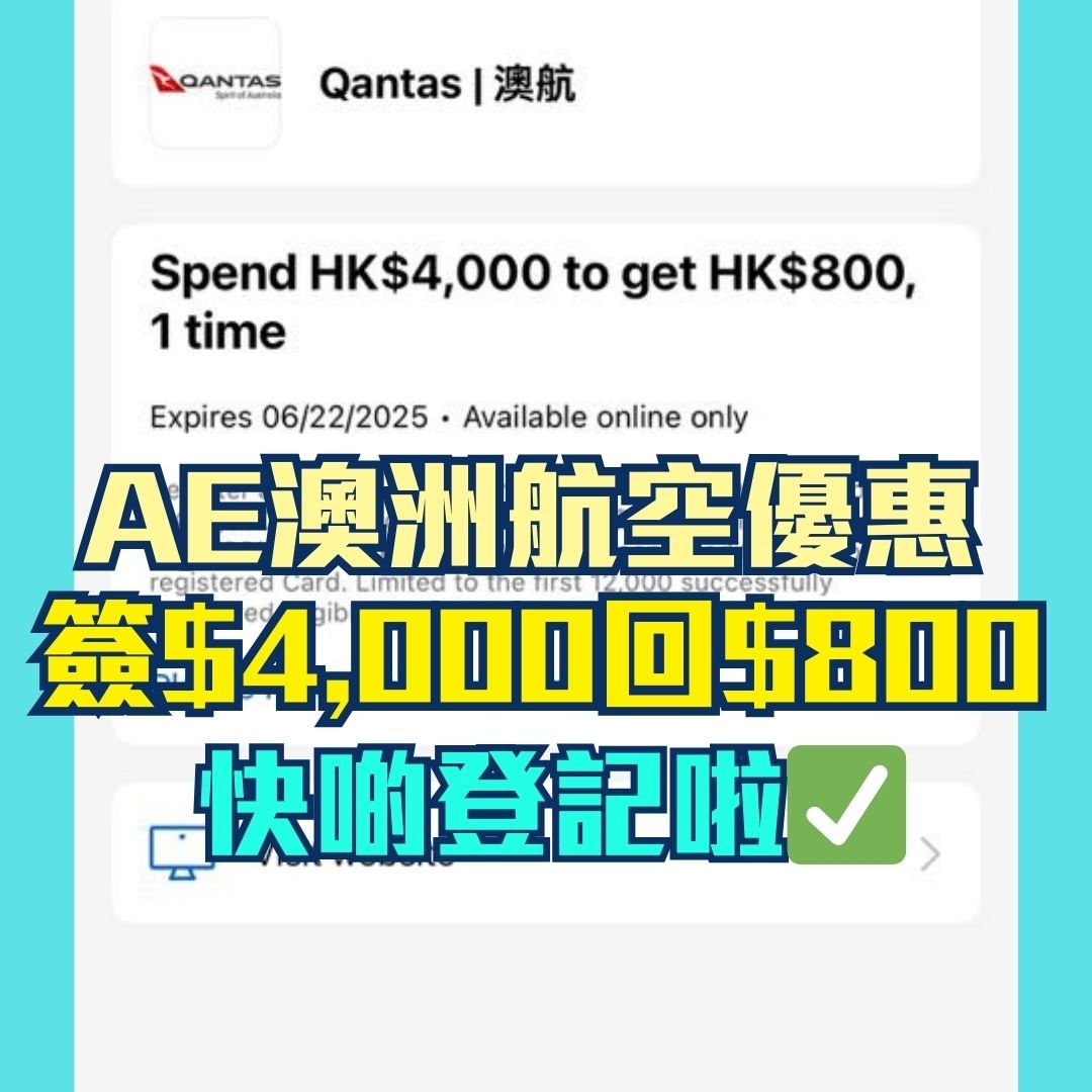 AE信用卡比較 澳洲航空優惠好抵!簽HK$4,000回HK$800簽賬回贈。優惠期由即日起做到2025年6月22日。名額有限12,000個。嚟緊去澳洲或者會坐Qantas嘅話記得去Amex HK手機app要登記咗個優惠先!呢排仲有AE酒店優惠,趁有優惠book完機票再一條龍book埋住宿啦。