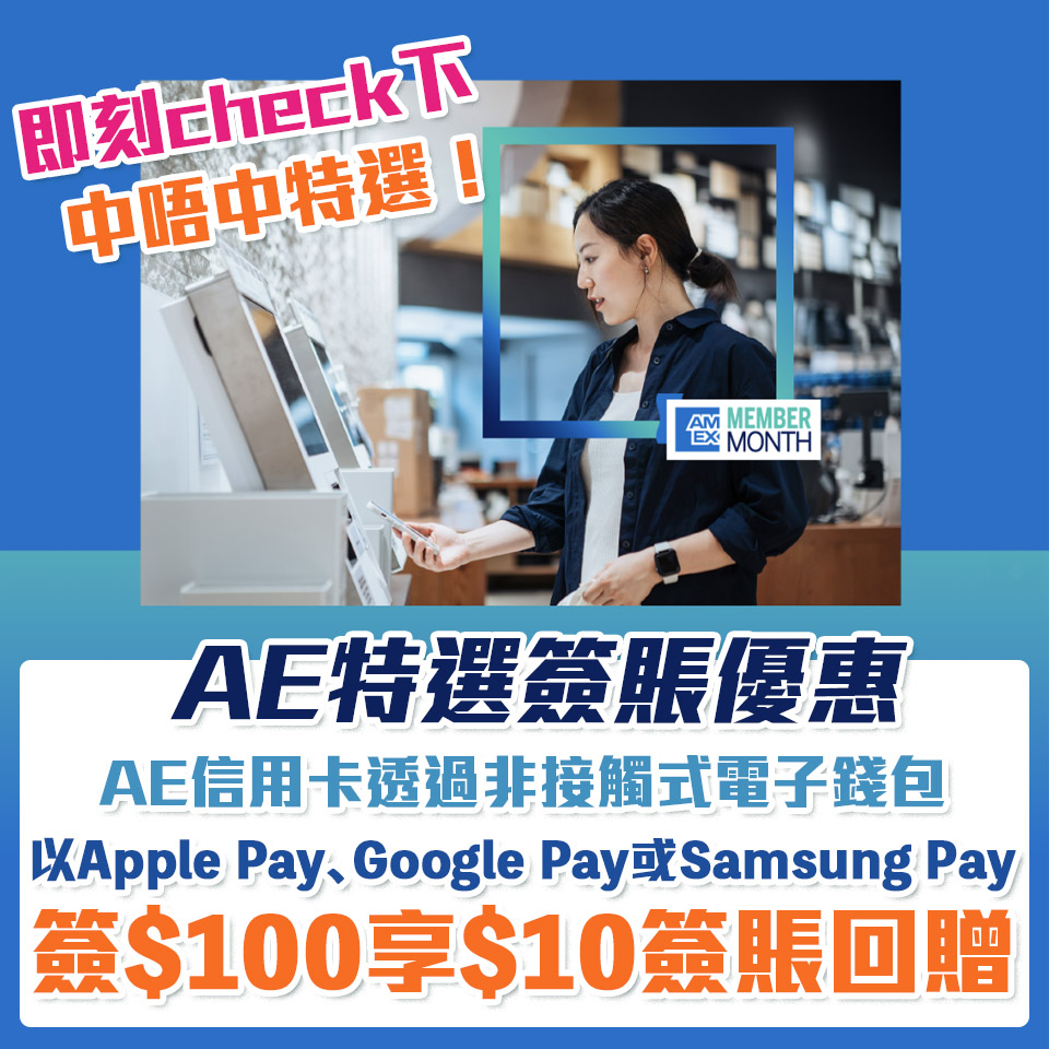 • 特選AE信用卡客戶成功登記AE卡並以非接觸式電子錢包 Apple Pay、Google Pay™或 Samsung Pay累積簽賬滿每HK$100可享 HK$10簽賬回贈
