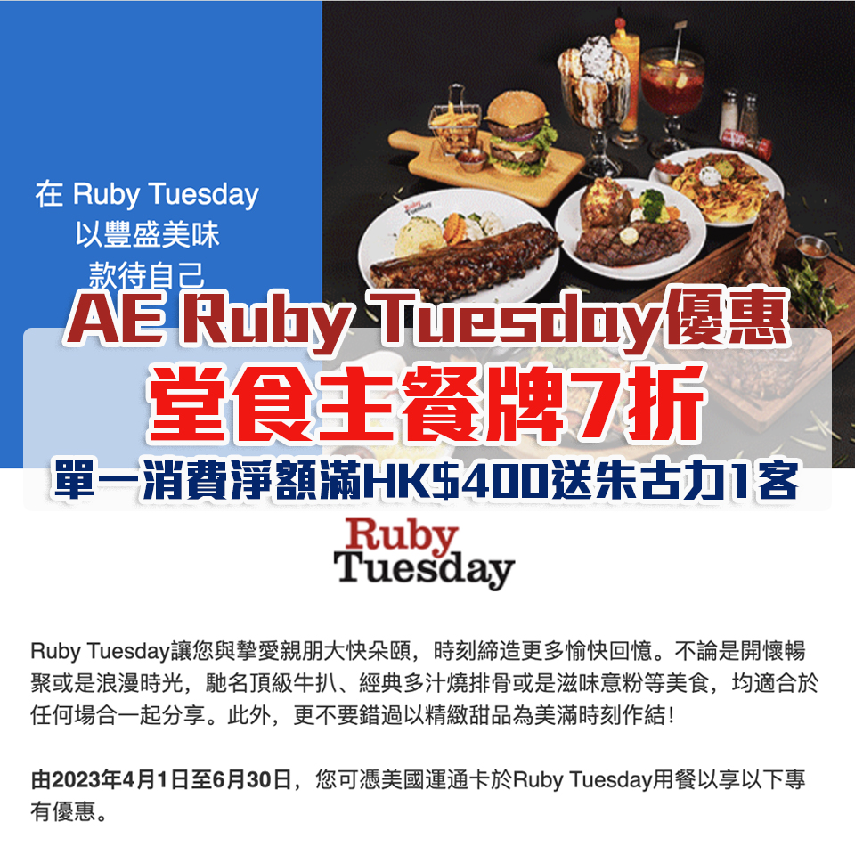 詳情:https://www.americanexpress.com/zh-hk/benefits/offers/dining/ruby-tuesday/