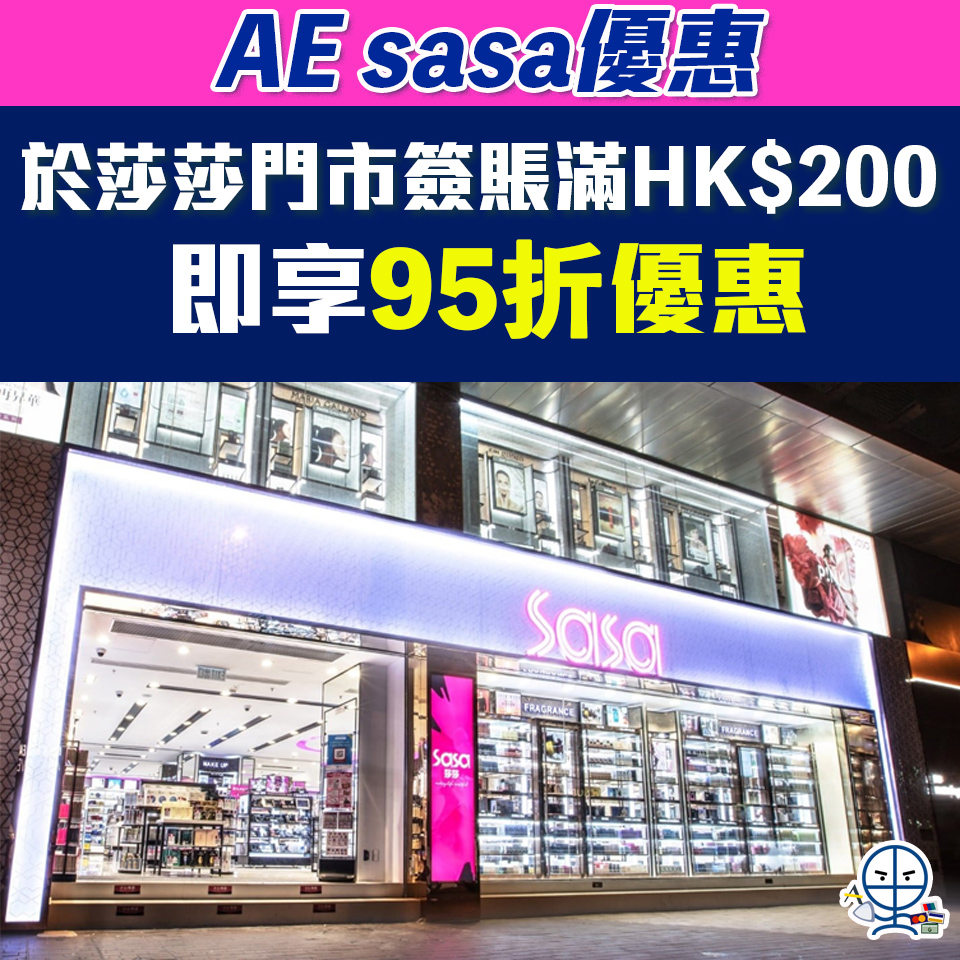 AE最新sasa優惠!憑AE信用卡於莎莎門市單次簽賬滿HK$200可享95折優惠!