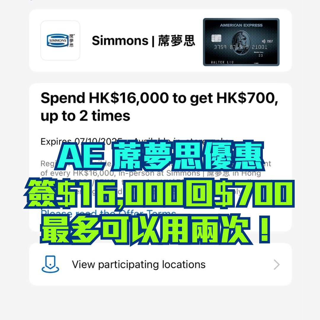 準備搬屋或者想買新床褥嘅留意啦,AE 信用卡蓆夢思優惠,憑已登記卡喺門市簽賬滿HK$16,000可享HK$700簽賬回贈,優惠最多用兩次,合共最多回HK$1,400, 一家人要買幾張嘅話就建議分單賺曬兩次優惠。
