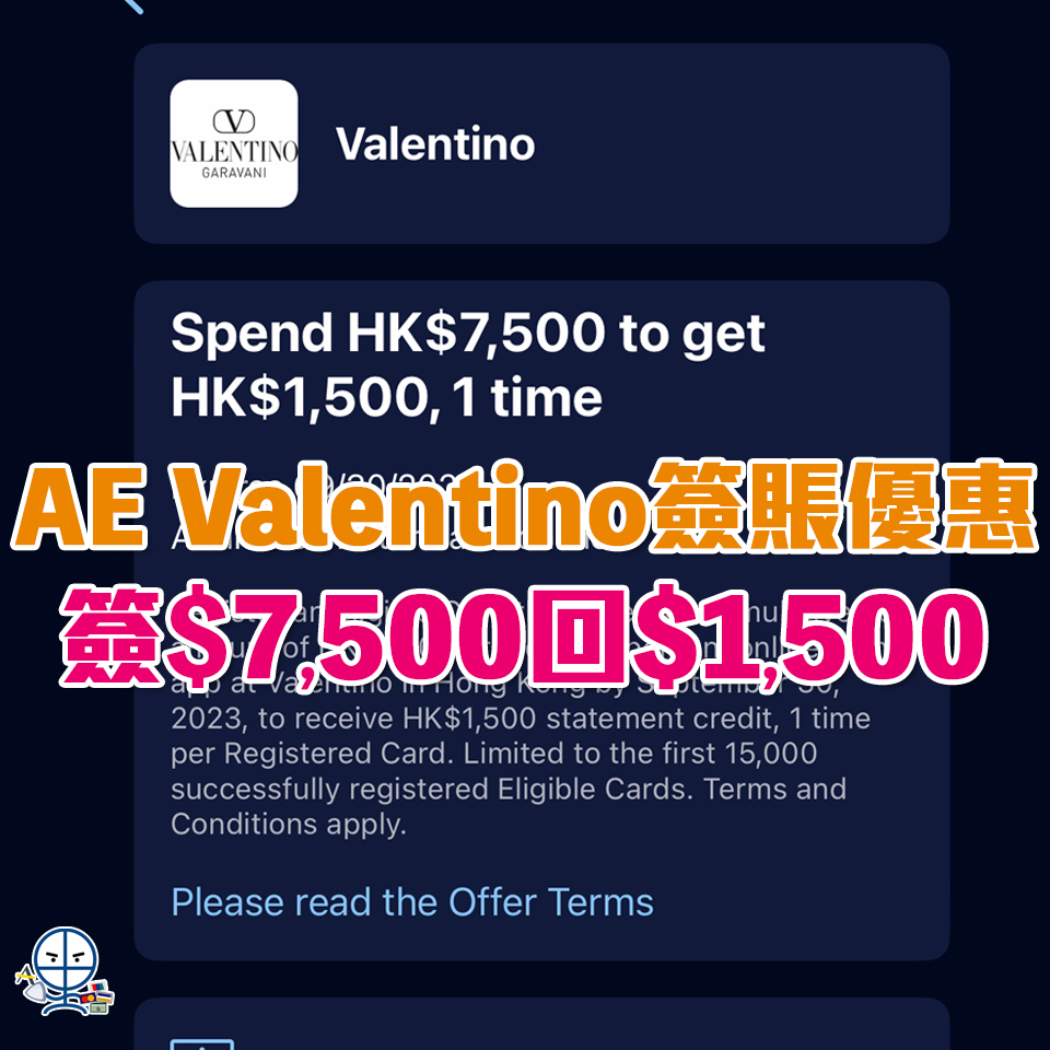 AE 出咗Valentino簽賬優惠。憑已登記AE信用卡於Valentino門市、網店或手機App累積簽賬滿HK$7,500或以上,可享HK$1,500簽賬回贈呀!如果平時有留意開呢個品牌嘅話,今次真係入手好時機呀。優惠由即日起做到2023年9月30日,名額有限15,000個,大家shopping前記得去Amex HK手機App登記咗先。