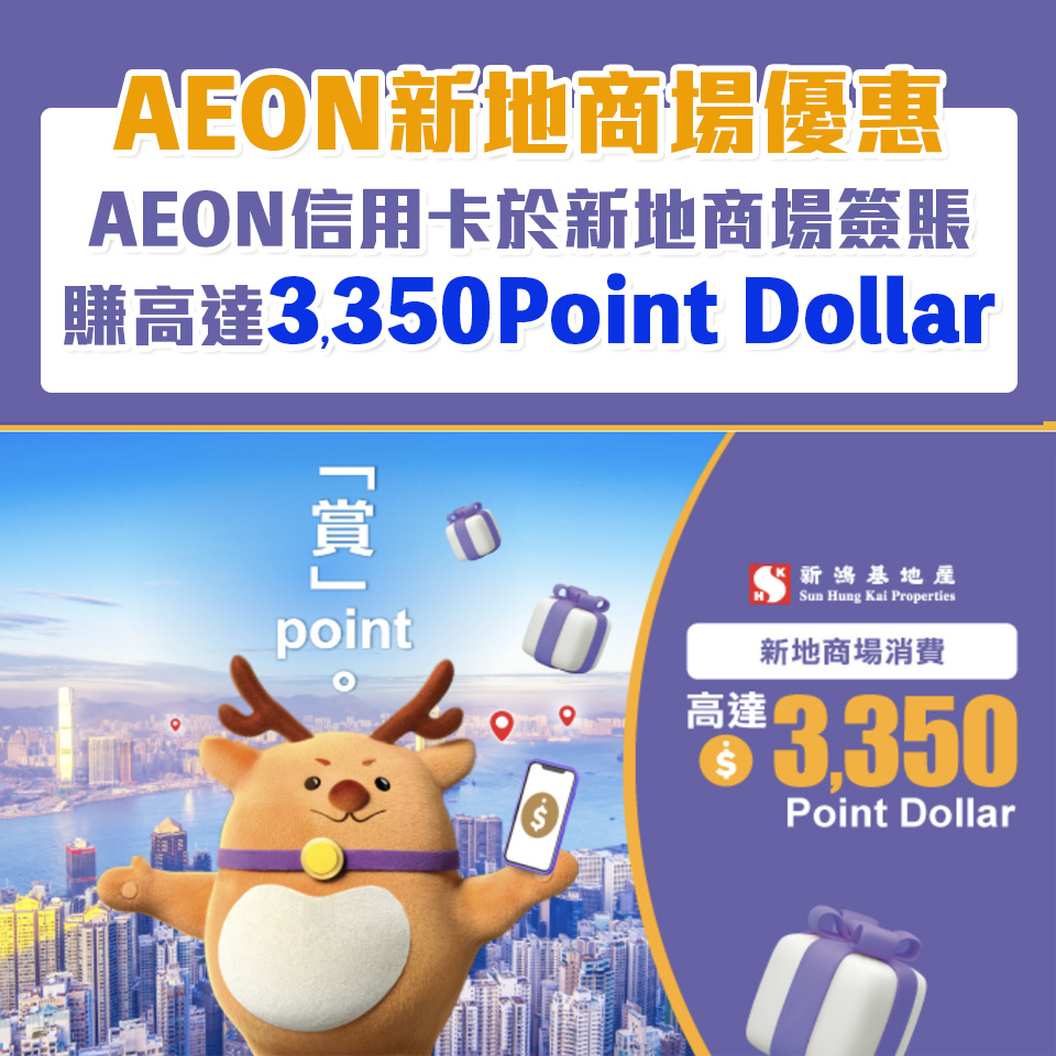 - 憑AEON信用卡於新地商場即日累積簽賬滿指定金額,賞你高達 3,350 Point Dollar