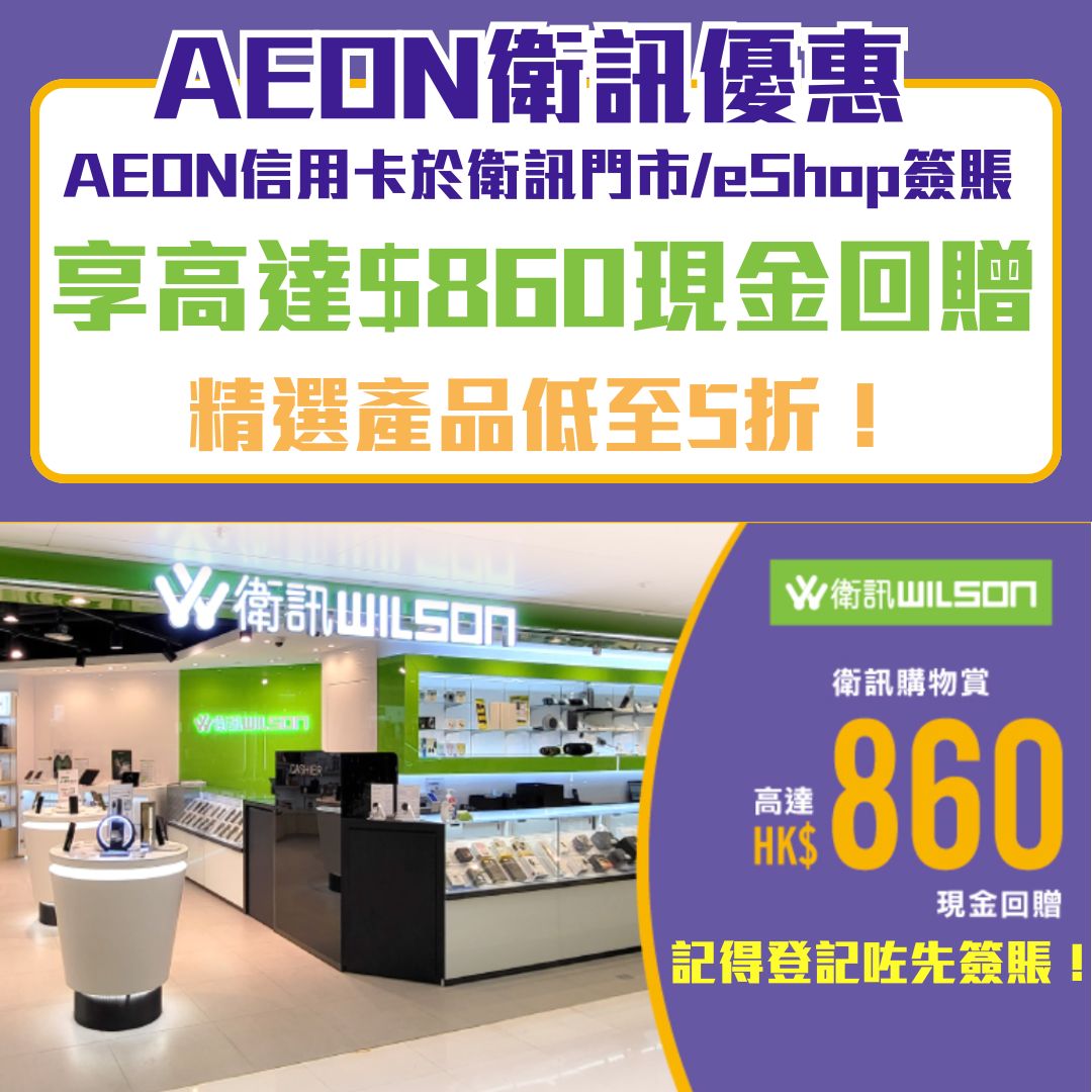 - 優惠一:憑已登記AEON信用卡於衛訊門市/eShop簽賬可享高達HK$860現金回贈: