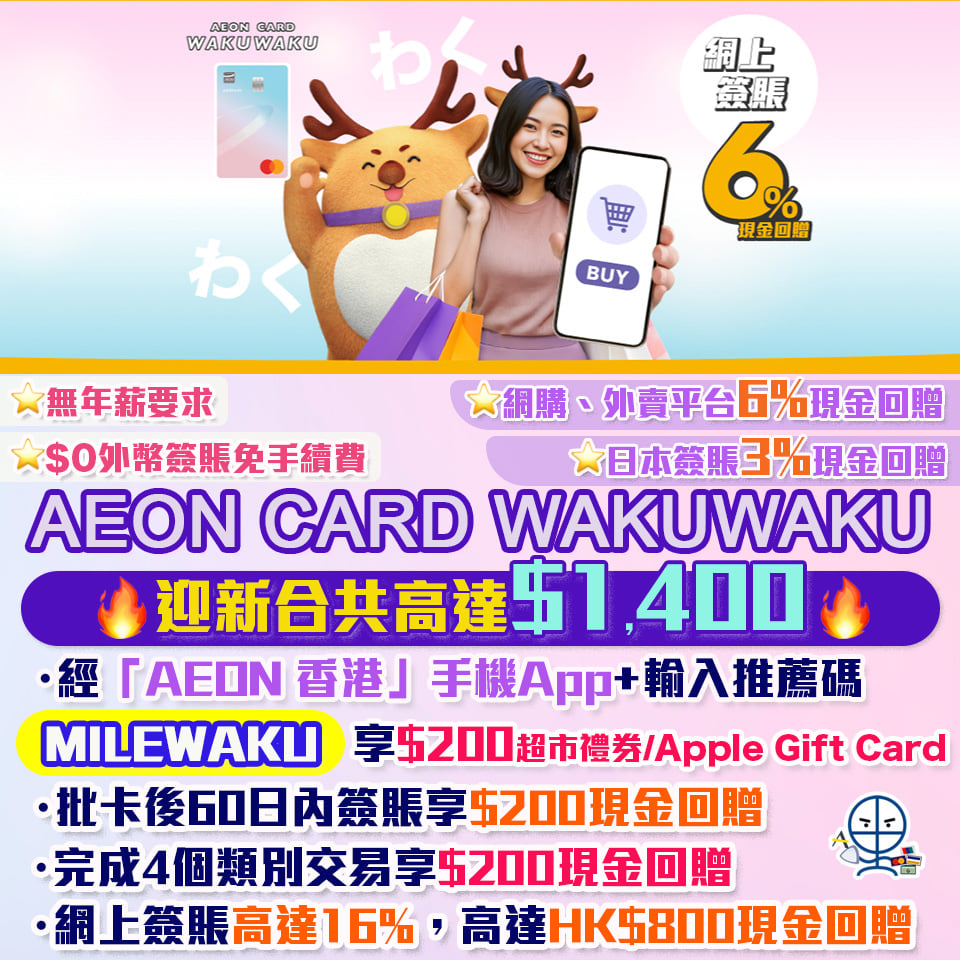 - 申請AEON CARD WAKUWAKU迎新合共高達HK$900回贈,詳情請睇內文。
