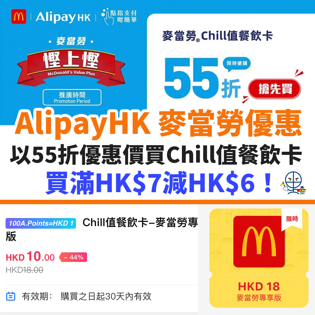 AlipayHK又同麥當勞合作推出新優惠!大家可以係AlipayHK app以55折優惠價買Chill值餐飲卡,買滿HK$7就即減HK$6!喺麥當勞門市同手機app落單都用得㗎!