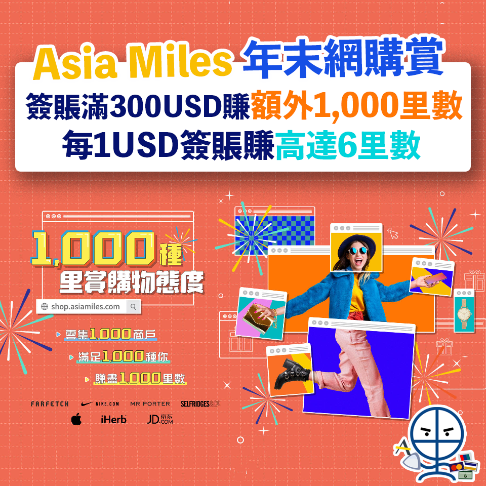 【Asia Miles 年末網購狂賺1,000里數】每1USD簽賬賺高達6里數 簽賬滿300USD賺額外1,000里數❗️