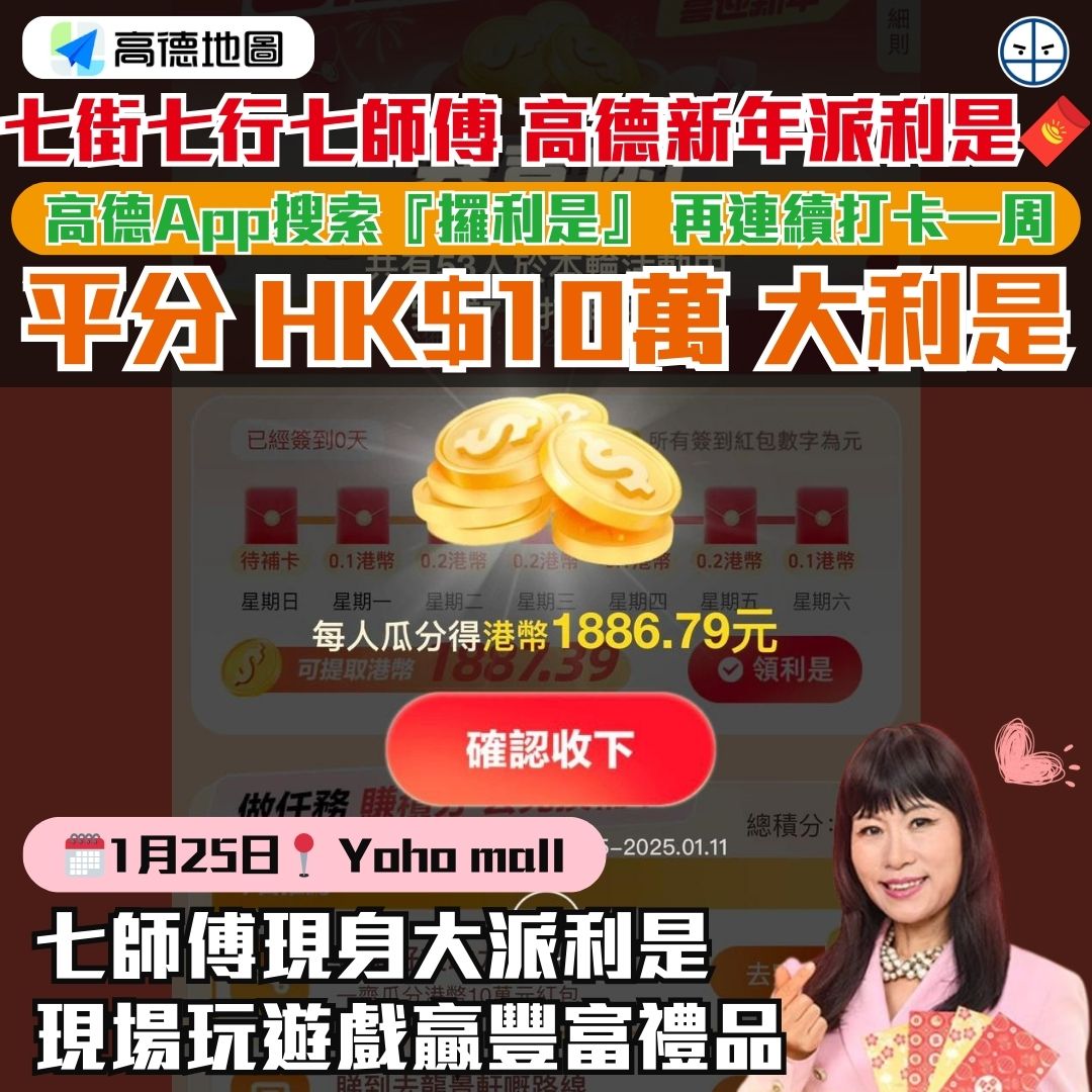 高德地圖 App 七街七行七師傅 高德新年派利是:每日打卡拎利是,連續打卡滿一周有得平分 HK$10萬大利是(遲咗都仲可以補打卡)!1月25日喺 Yoho Mall I仲有七師傅大派利是;1月25日至2月1日期間,現場有得玩遊戲赢豐富禮品!