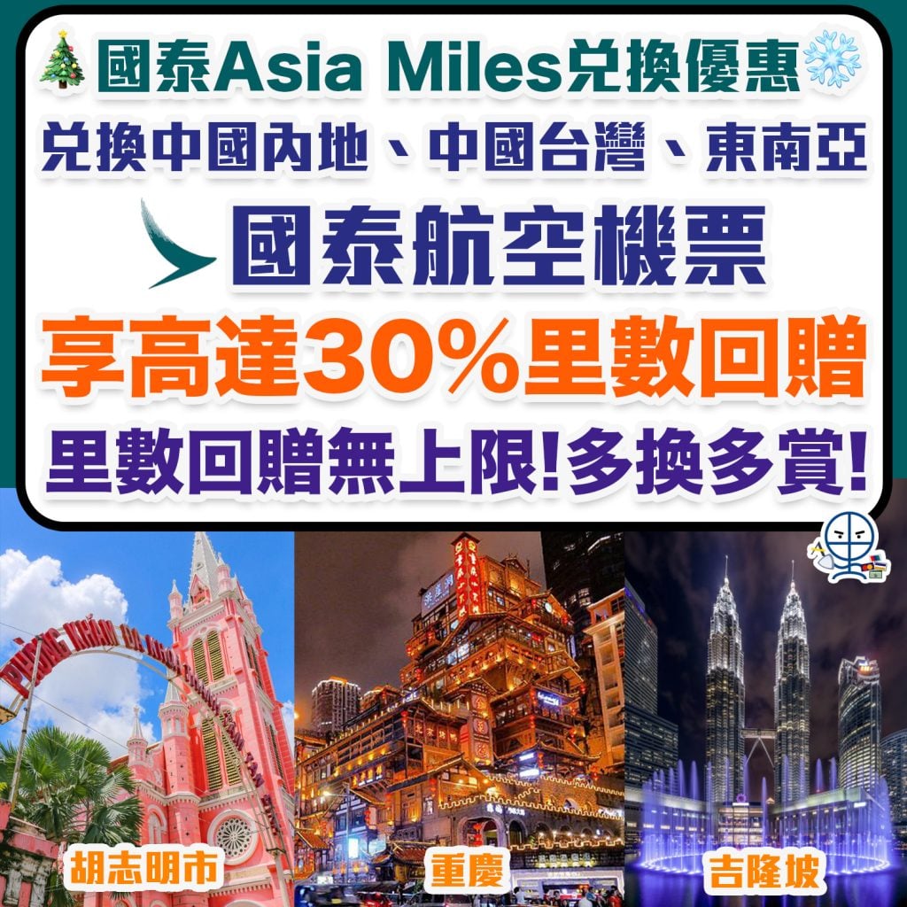 國泰Asia Mile推出咗Asia Miles兌換優惠!只要登記優惠後用Asia Miles兌換中國內地、馬來西亞、泰國、新加坡、印尼、越南、柬埔寨、菲律賓、台灣嘅機票,就可享高達30%里數回贈!今次優惠係以1程機票嚟計算,即係換1趟來回機票就已經計算2次!換夠2趟來回機票就可以食到到30%回贈!另外混艙兌換同open jaw中斷行程亦都可以享受優惠!即係好似去程換經濟艙去杭州、回程換商務艙由上海返嚟都可以㗎!咁就可以1張飛玩曬幾個城市啦!Plan緊出年1-3月會去中國內地、東南亞或者中國台灣嘅朋友絕對唔好錯過呢個優惠!計返30%里數回贈部份航點低至4,900里就換到,非常抵玩!