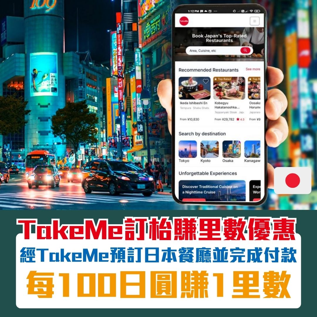 答:TakeMe訂枱優惠以每消費100日圓賺取1里數計算。