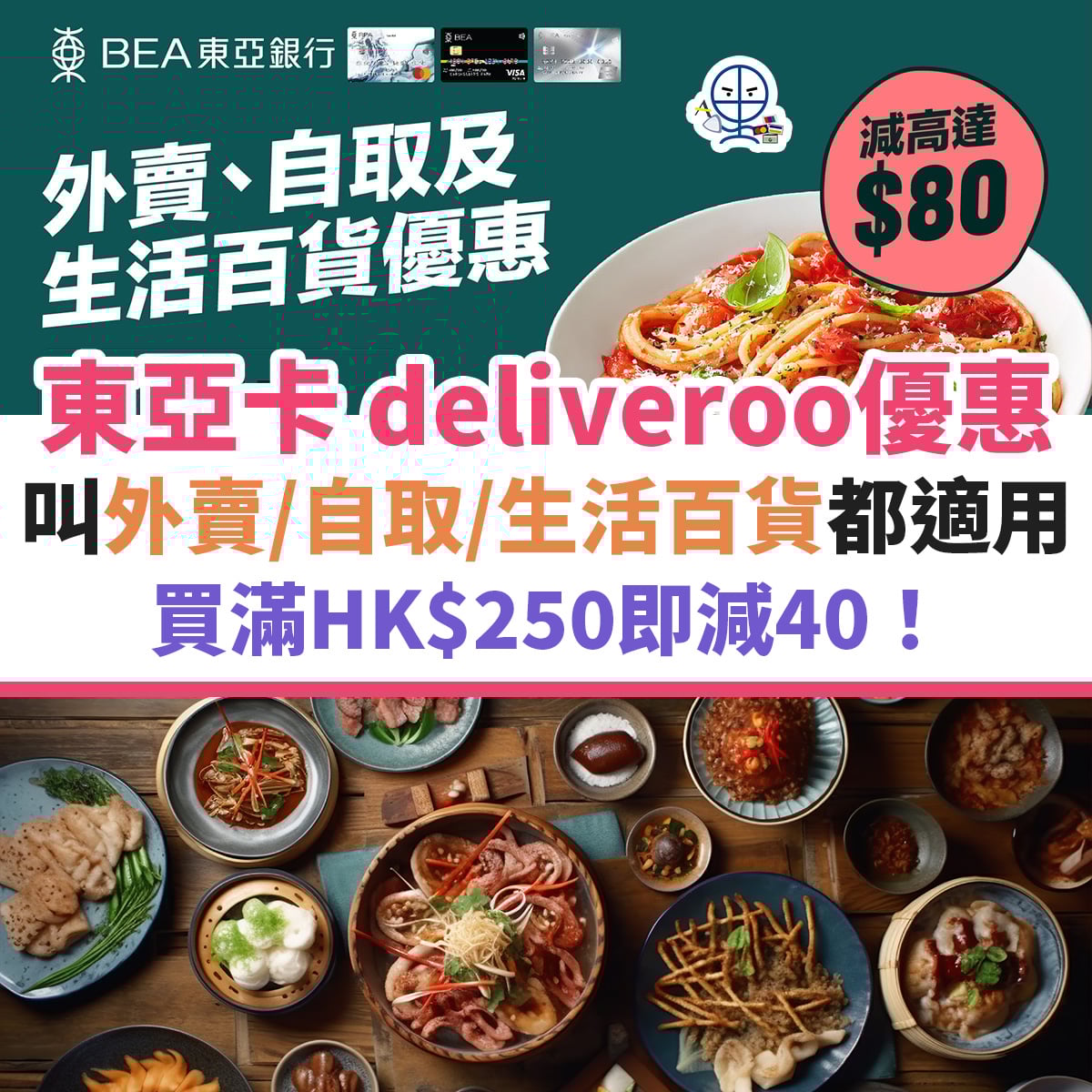 - 用東亞信用卡於Deliveroo叫外賣/自取/生活百貨,滿HK$250即減HK$40