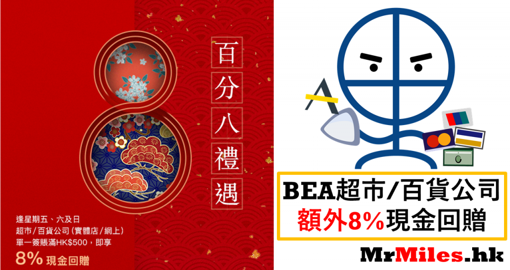 自從見東亞推咗個regular promotion 東亞日星期六日4.4%現金回贈之後真係少啲見東亞再推大promo,不過東亞逢過年過節就梗有啲優惠做下,今年都唔例外有個好啱要去辦年貨嘅優惠。好簡單無需要登記只要係星期五六日去超級市場或百貨公司簽賬夠$500都會有8%現金回贈!但記得唔可以加埋 東亞日星期六日4.4%現金回贈,因為東亞日唔包超市同百貨公司!如果用BEA Flyer World儲里數的話照樣有里數+8%回贈。所以要辦年貨嘅話記得拎定張東亞信用卡啊!