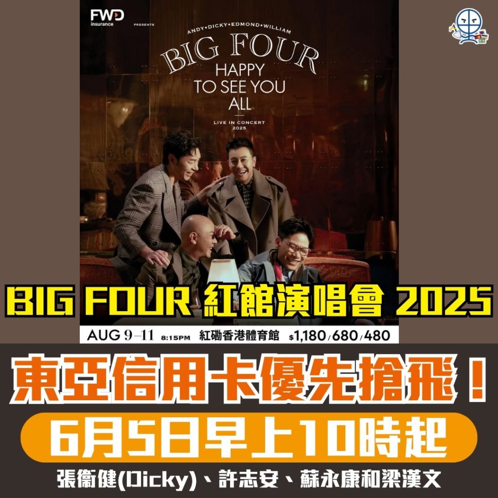 張衞健(Dicky)、許志安、蘇永康和梁漢文(Edmond)組合 – BIG FOUR 將於2025年8月9至11日在紅館舉行「BIG FOUR HAPPY TO SEE YOU ALL演唱會2025」!東亞信用卡6月5日早上10時優先發售!一文睇晒時間/門票價格/發售詳情/座位表。