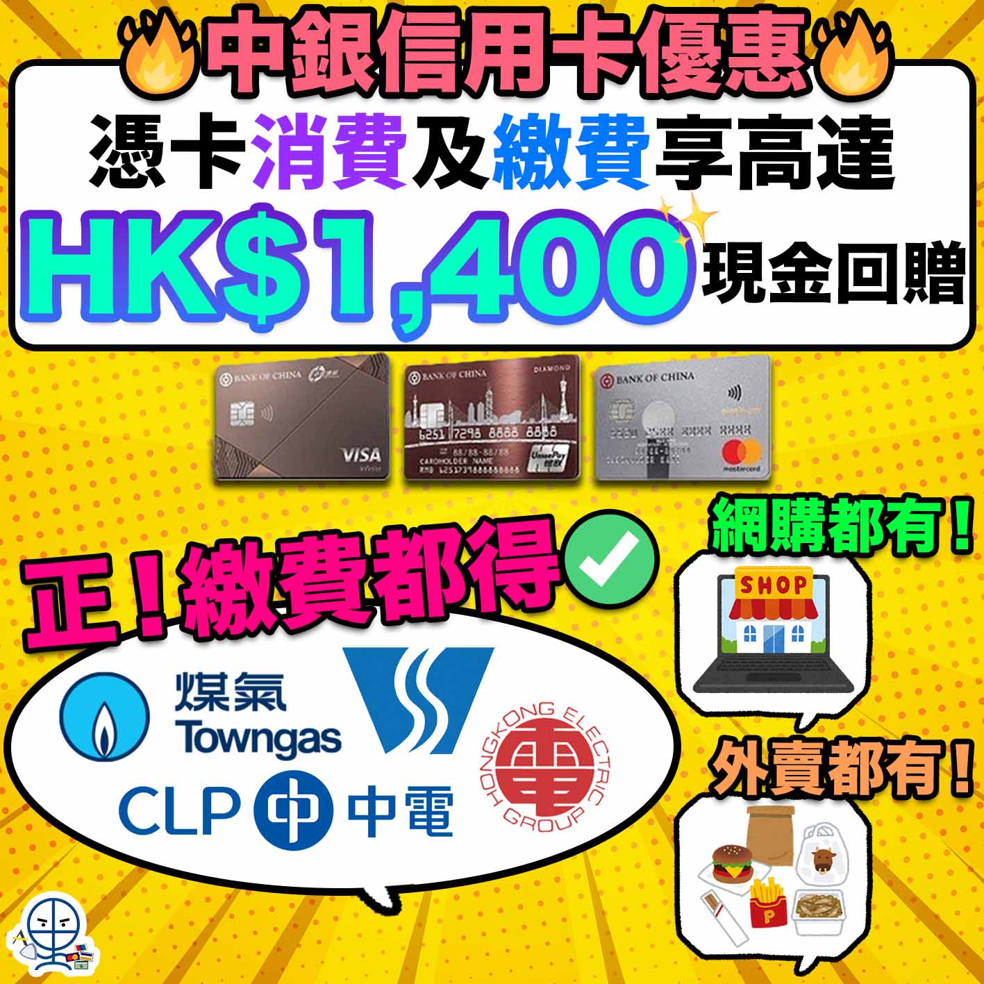- 答:依家用中銀信用卡消費及繳費享高達HK$1,400現金回贈!