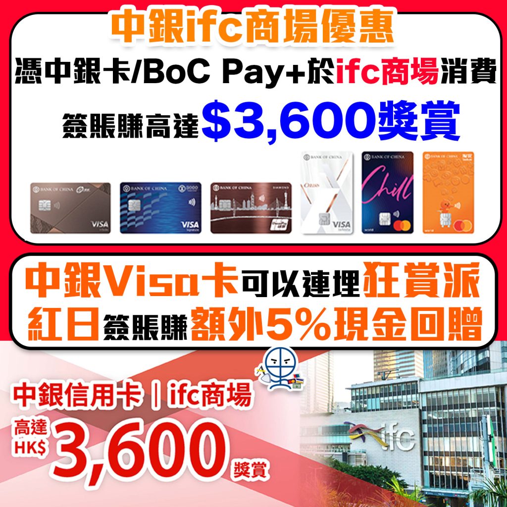 - 憑中銀信用卡/BoC Pay+ 喺ifc商場消費,即日累積簽賬滿指定金額賺高達$3,600獎賞