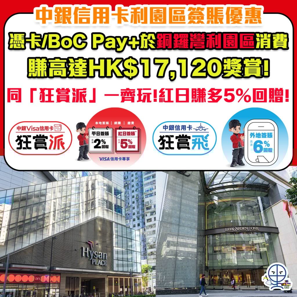 【中銀 利園區優惠】中銀信用卡/BoC Pay+ 於利園商場簽賬賺高達$17,120獎賞!