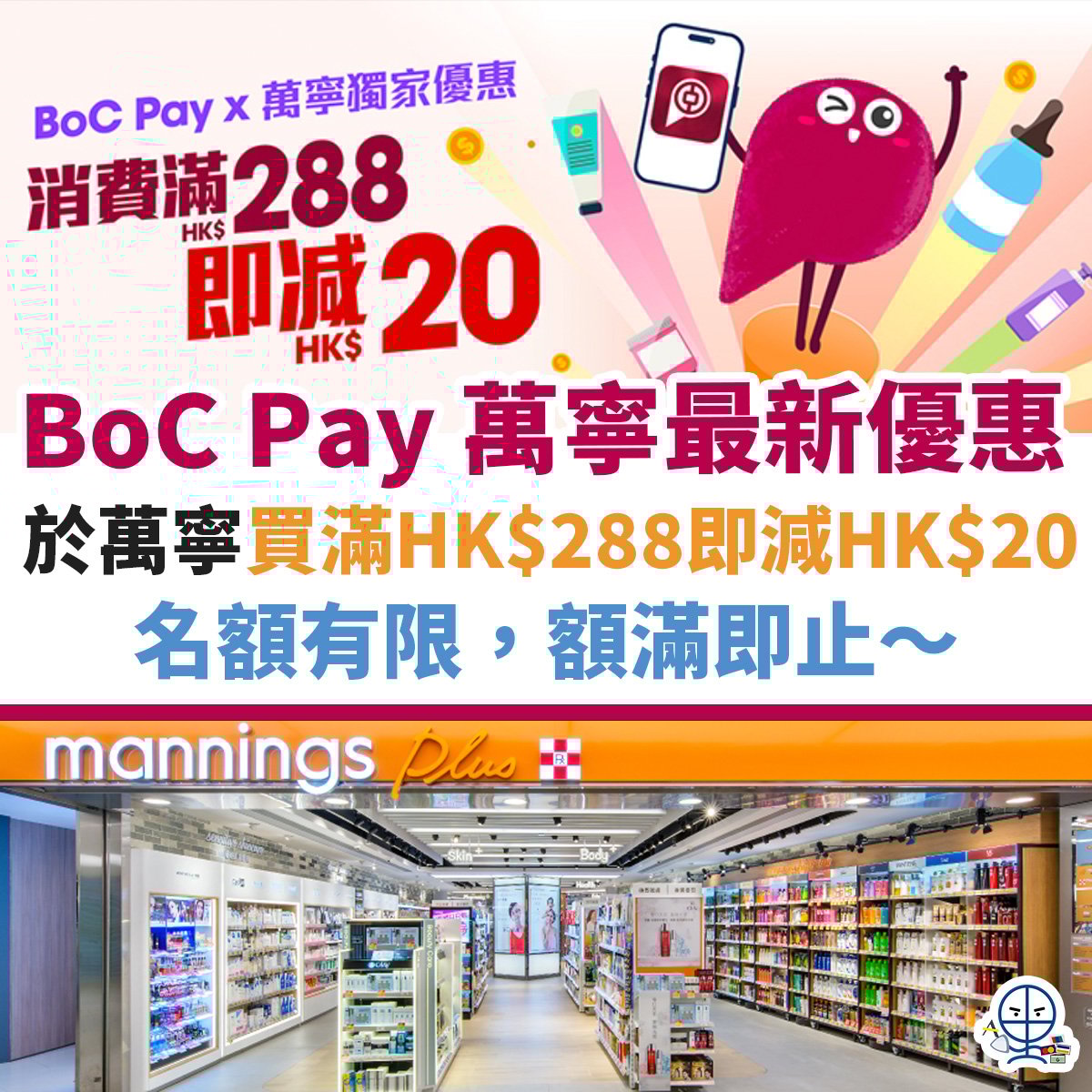 - 於萬寧消費滿HK$288,用BoC Pay付款,即可減HK$20