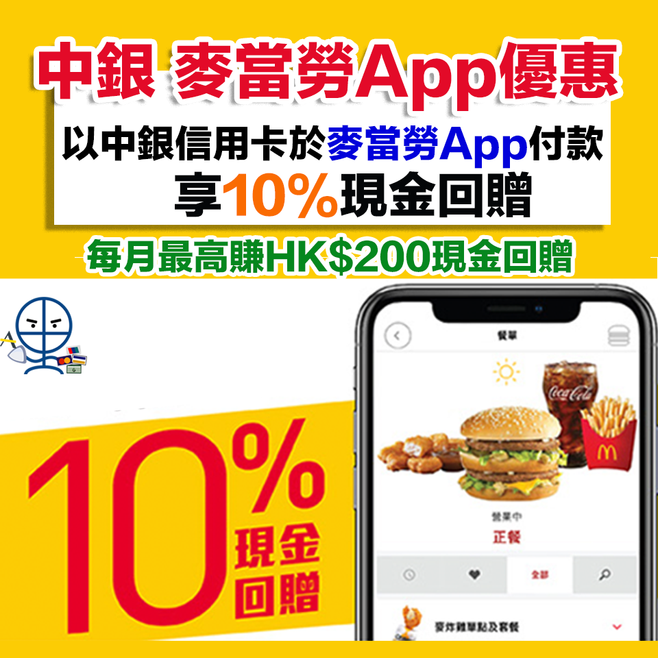 【中銀 麥當勞App優惠】以中銀信用卡於麥當勞App付款享10%現金回贈 每月最高賺HK$200現金回贈