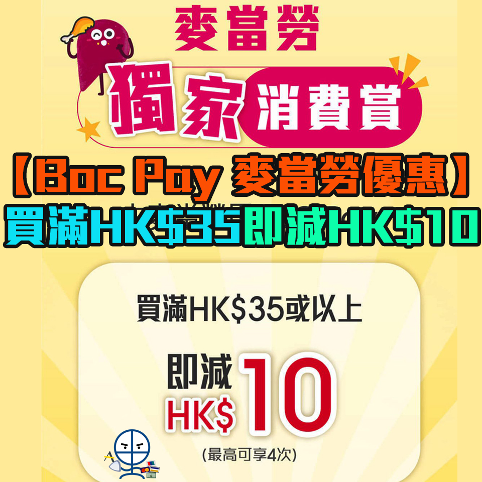 • 憑BoC Pay於麥當勞單一消費HK$35或以上即減HK$10