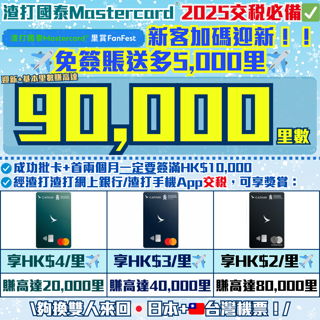 12 thoughts on “【渣打國泰Mastercard®】12月新客加碼5,000里✈️交稅迎新+基本里數賺高達90,000里數!現有信用卡客戶免簽賬賺5,000里!年薪只需HK$9.6萬!免首年年費!”