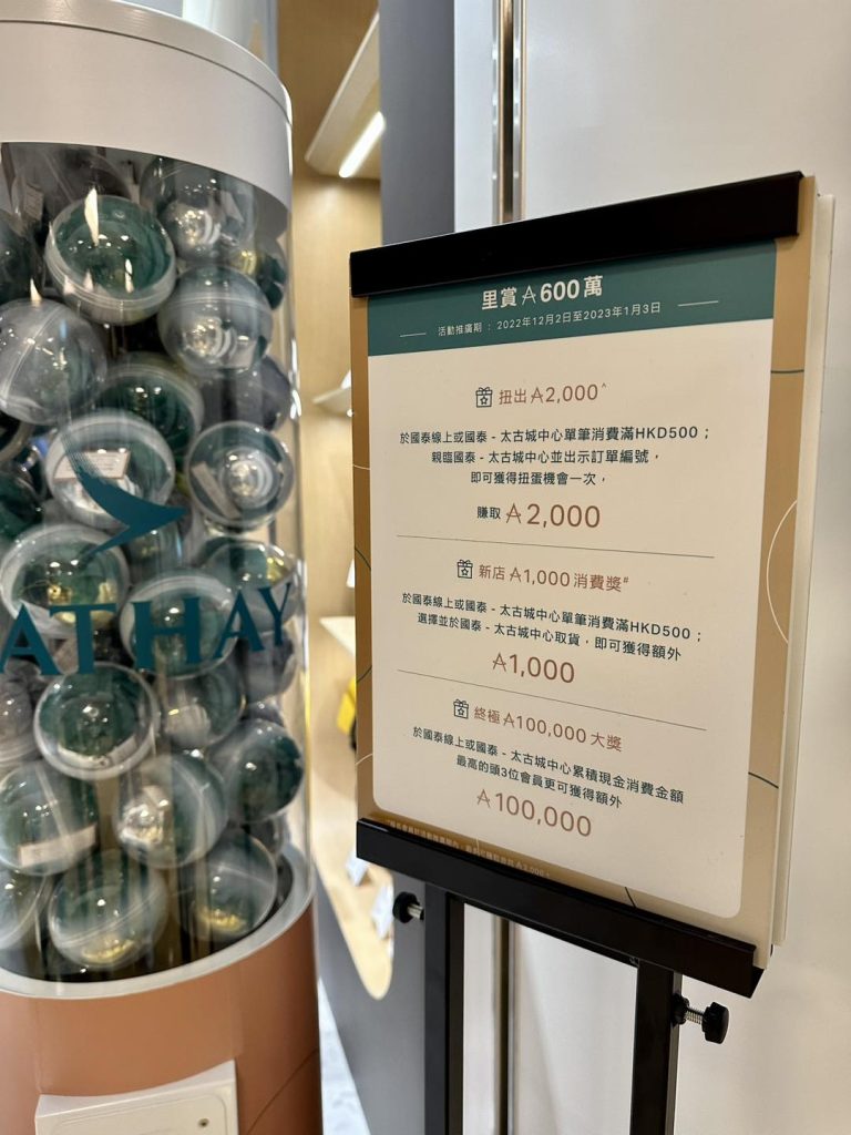 - Cathay online shop/現場買滿HK$500,送個抽扭蛋機會,全部禮品都係2,000里(名額1900個,限1次,唔係所有禮品都可以揀到店取貨啊,最好落去邊睇邊揀)