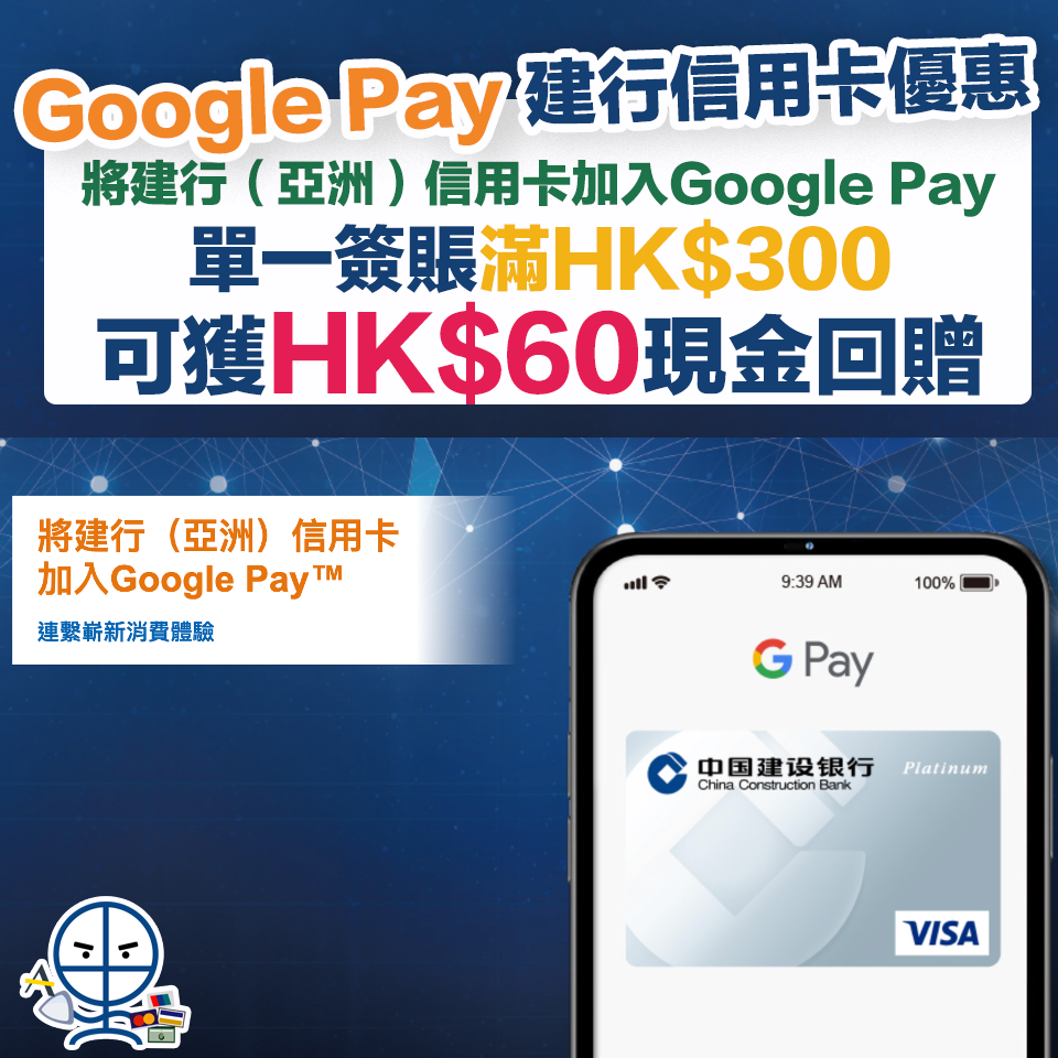 【Google Pay CCB建行信用卡優惠】綁定建行(亞洲)Visa及萬事達卡信用卡憑Google Pay單一簽賬滿HK$300享HK$60現金回贈