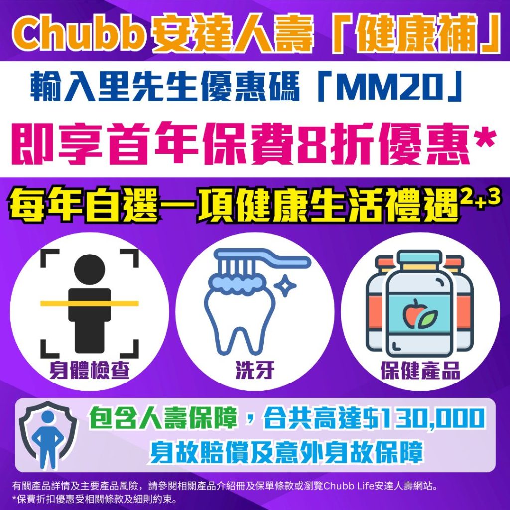Chubb Life安達人壽健康補保障計劃:現時輸入Chubb優惠碼「MM20」即享首年保費8折優惠*!投保後每年可自選一項身體檢查、洗牙或保健產品²,³,仲有合共高達港幣$130,000的身故賠償及意外身故保障的人壽保障⁴!無需回答任何健康問題,輕鬆網上申請!