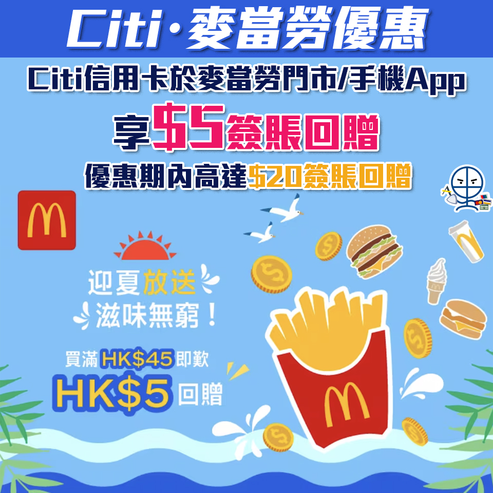 - 憑Citi信用卡於麥當勞餐廳或手機App單一簽賬HK$45或以上即享HK$5簽賬回贈