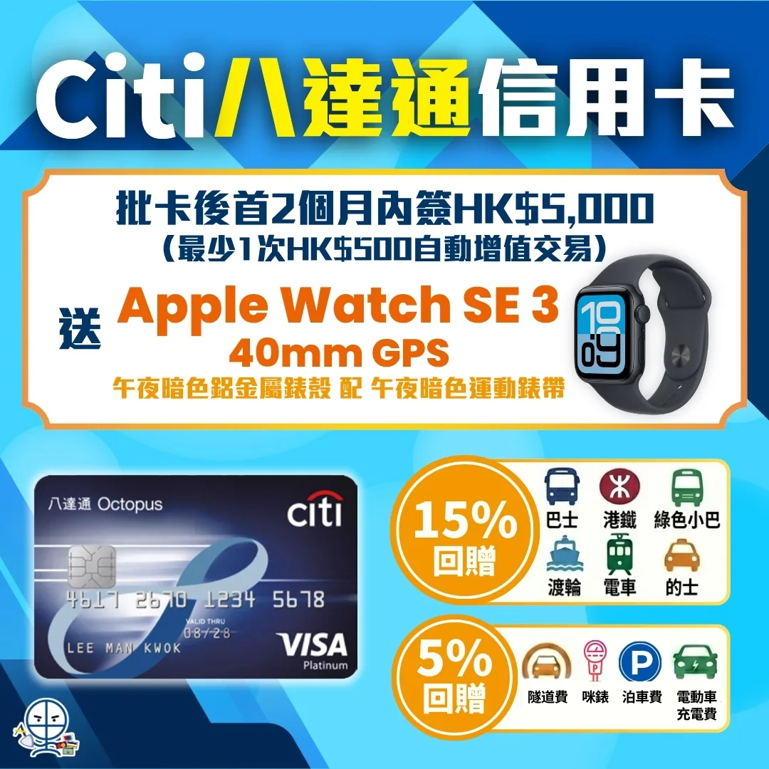 Citi八達通信用卡迎新^:新客戶^喺批卡後首2個月內簽HK$5,000&並作最少1次HK$500自動增值交易,送你Apple Watch SE 3 40mm GPS*!搭公共交通工具高達15%車費回贈#,仲有5%隧道(「易通行」增值)、泊停車場、咪錶同電動車充電回贈#!