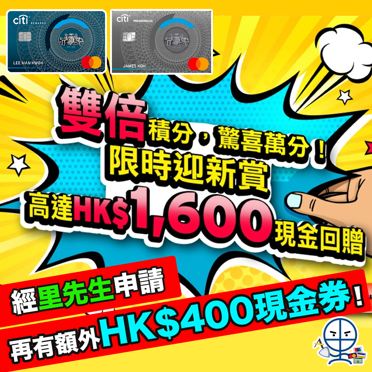 【Citi信用卡激賺HK$2,000】Citibank PremierMiles/Rewards限時offer! 經指定連結申請享限時雙倍積分 迎新享高達HK$1,600現金回贈!經里先生申請再賺HK$400現金券!