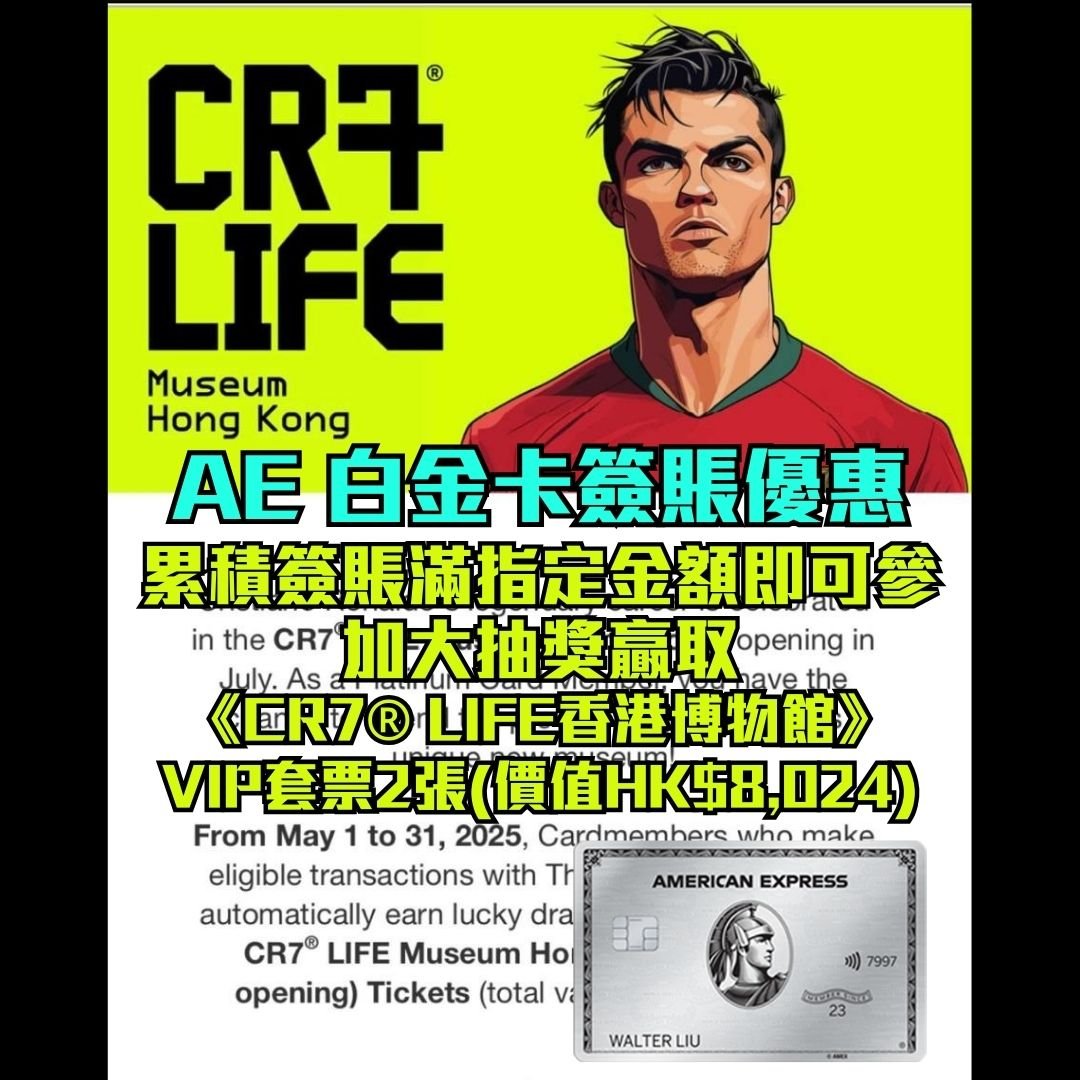 召喚C朗Fans!嚟緊7月喺K11 MUSEA 有C 朗主題嘅《CR7® LIFE香港博物館》,憑AE白金卡簽賬即可參加大抽獎,有機會贏取《CR7® LIFE香港博物館》VIP套票2張(價值HK$8,024),優惠期由2025年5月1日至31日。