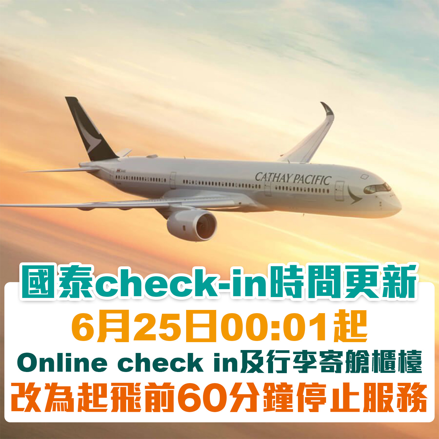2024年6月25日00:01起,國泰行李寄艙櫃檯及網上辦理登機手續時間會更新為航班出發前60分鐘準時停止服務!比現時cut off時間提早咗,準備飛嘅朋友仔要留意早啲到機場喇!