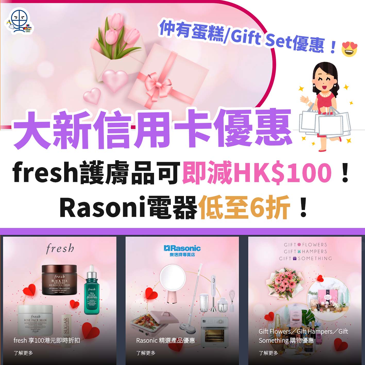 大新信用卡推出咗新優惠!送禮自用都啱哂!唔單止有fresh折扣滿HK$500即減HK$100,仲有Rasonic電器優惠低至6折!氣炸爐原價HK$1,480減到HK$880!另外仲有其他參與商戶仲唔同種類嘅Gift Set蛋糕都有折!大新ONE+/英航信用卡都用得!卡主不妨留意吓啦!