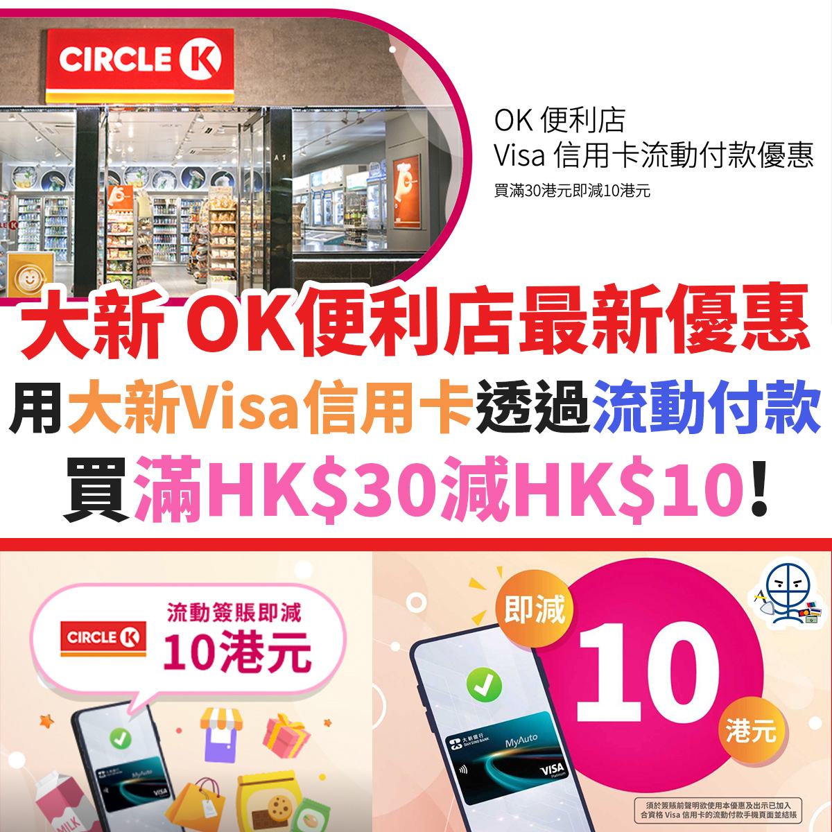 • 答:大家只要喺推廣期間用大新Visa信用卡於OK便利店透過流動付款買滿HK$30就可以減HK$10~