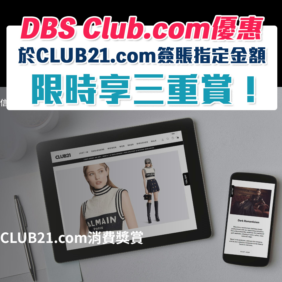 DBS最新同CLUB21.com優惠,憑DBS信用卡喺CLUB21.com購買即可享下3重賞: