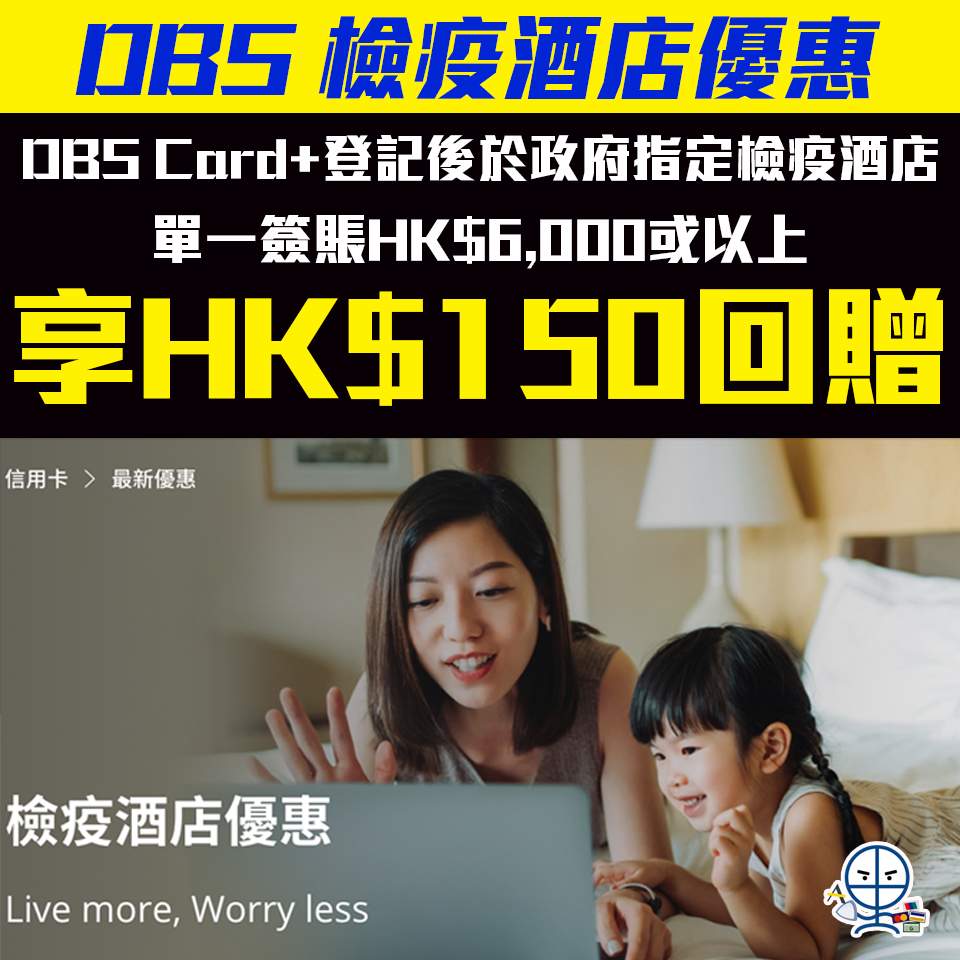 5. 持卡人於推廣期內以適用信用卡於政府指定檢疫酒店名單(https://www.coronavirus.gov.hk/chi/designated-hotel.html)* 的酒店,單一淨額簽賬滿HK$6,000或以上(「合資格交易」),可享該合資格交易的應付金額扣減 HK$150(「回贈」)。