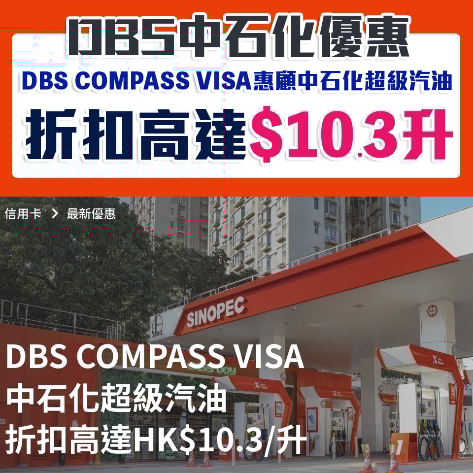 DBS中石化入油優惠!逢星期一至五憑DBS COMPASS VISA於中石化惠顧中石化超級汽油折扣高達HK$10.3/升!