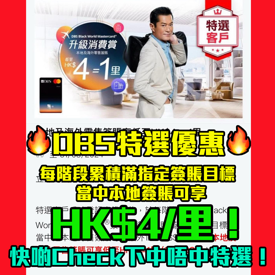 DBS信用卡特選優惠!憑已登記DBS Black World Mastercard於優惠期內累積滿指定簽賬目標(金額人人唔同),當中本地零售簽賬可享低至HK$4/里!即刻去DBS Card+睇下自己中唔中到特選啦!