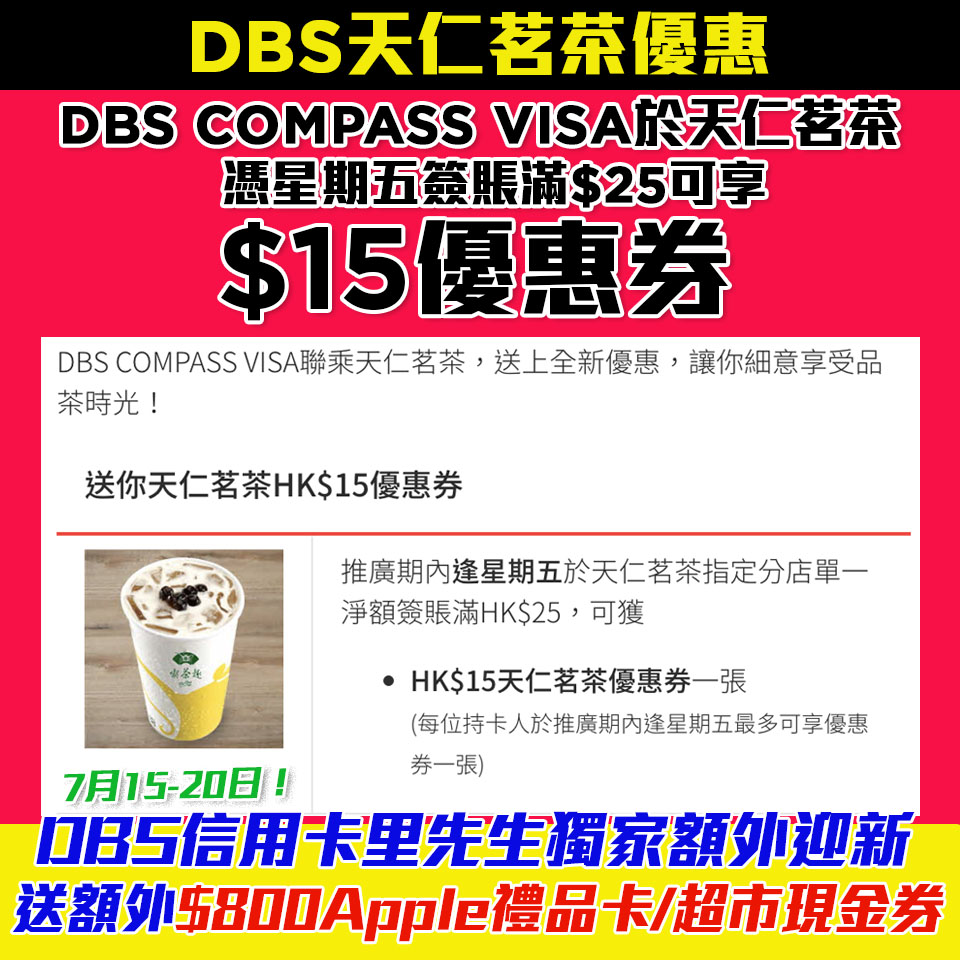 - 憑DBS COMPASS VISA逢星期五於天仁茗茶指定分店單一淨額簽賬滿HK$25,可獲HK$15天仁茗茶優惠券一張