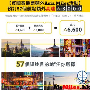 【買國泰機票額外Asia Miles活動】預訂57個航點額外高達3,000里數獎賞+AE CX Elite訂票額外1,000里