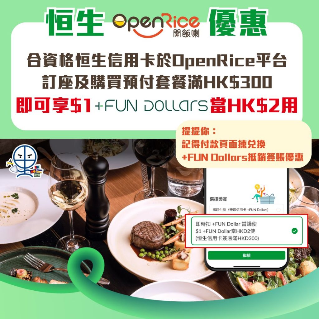 - OpenRice會員於優惠期內憑已連結之信用卡,透過OpenRice平台訂座及購買預付套餐(「交易」)單一簽賬淨值滿港幣300或以上,並選擇兌換 +FUN Dollars抵銷簽賬(「合資格兌換 +FUN Dollars交易」),即可以優惠兌換率$1 +FUN Dollar 當HKD2現金價值使用(「優惠」)。若客戶於優惠期以外選擇 +FUN Dollars抵銷購買預付套餐之簽賬,系統將自動以兌換率$1 +FUN Dollar 當HKD1 現金價值全數兌換。