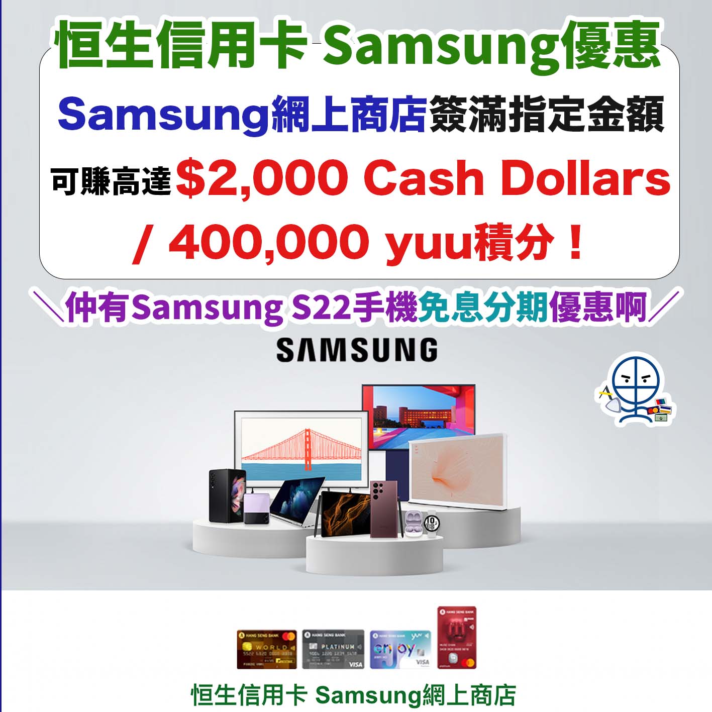 恒生信用卡 Samsung 優惠!於Samsung網上商店 簽滿指定金額即賺高達$2,000 Cash Dollars / 400,000 yuu積分!購買指定Samsung Galaxy S22 系列手機仲可以免息免手續費分期付款!用開Samsung Smartphone或者想轉手機嘅朋友千其唔好錯過啦!用埋恒生嘅簽賬激賞優惠﹐就可以再賺額外4% Cash Dollars / 4X yuu積分!記住用恒生信用卡就最抵啊!