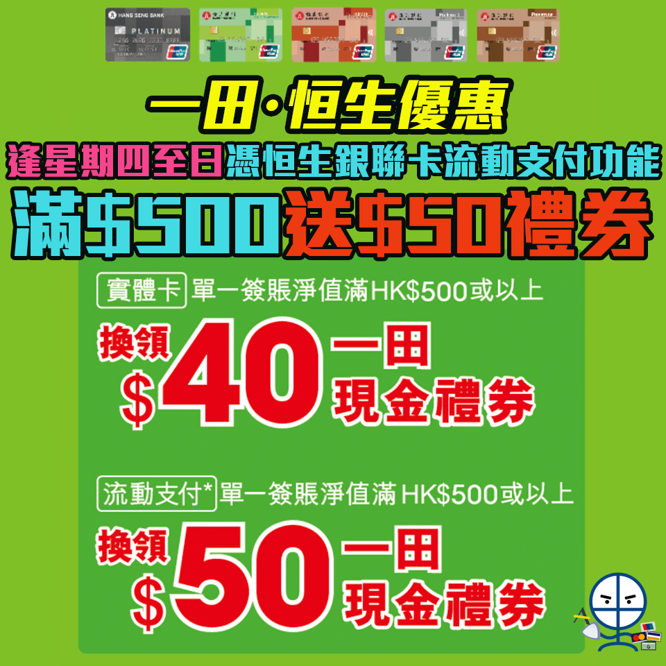 【一田・恒生優惠】逢星期四至日 憑恒生銀聯卡流動支付功能於全線一田單一簽賬滿HK$500送HK$50一田現金券❗️